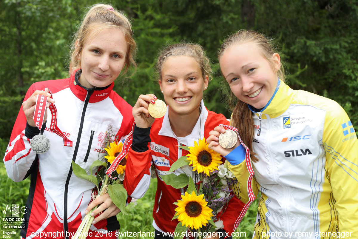 „I have always and repetitively come to short security stops to be able to clearly understand the map in this exceedingly detailed terrain”, stated Aebersold in the finish. “I absolutely also wanted to be successful in a forest race. Therefore, this gold medals means even a little more than the title in the sprint,” explained the young Swiss her success at the last of the individual races of this JWOC-week. The 20-year-old Aleksandra Hornik from Poland made for a huge surprise in coming in for the silver medal. “My very focussed attitude helped me to achieve one of my best competitions of my life despite a few minor insecurities”, explained Hornik her most important success of her past 4 JWOC-participations. 21 seconds down from silver, the Swede Johanna Öberg won the third bronze medal for Sweden. Three small mistakes cost the 20-year-old Swede another silver medal after having come in 2nd place 2015 in the middle distance.